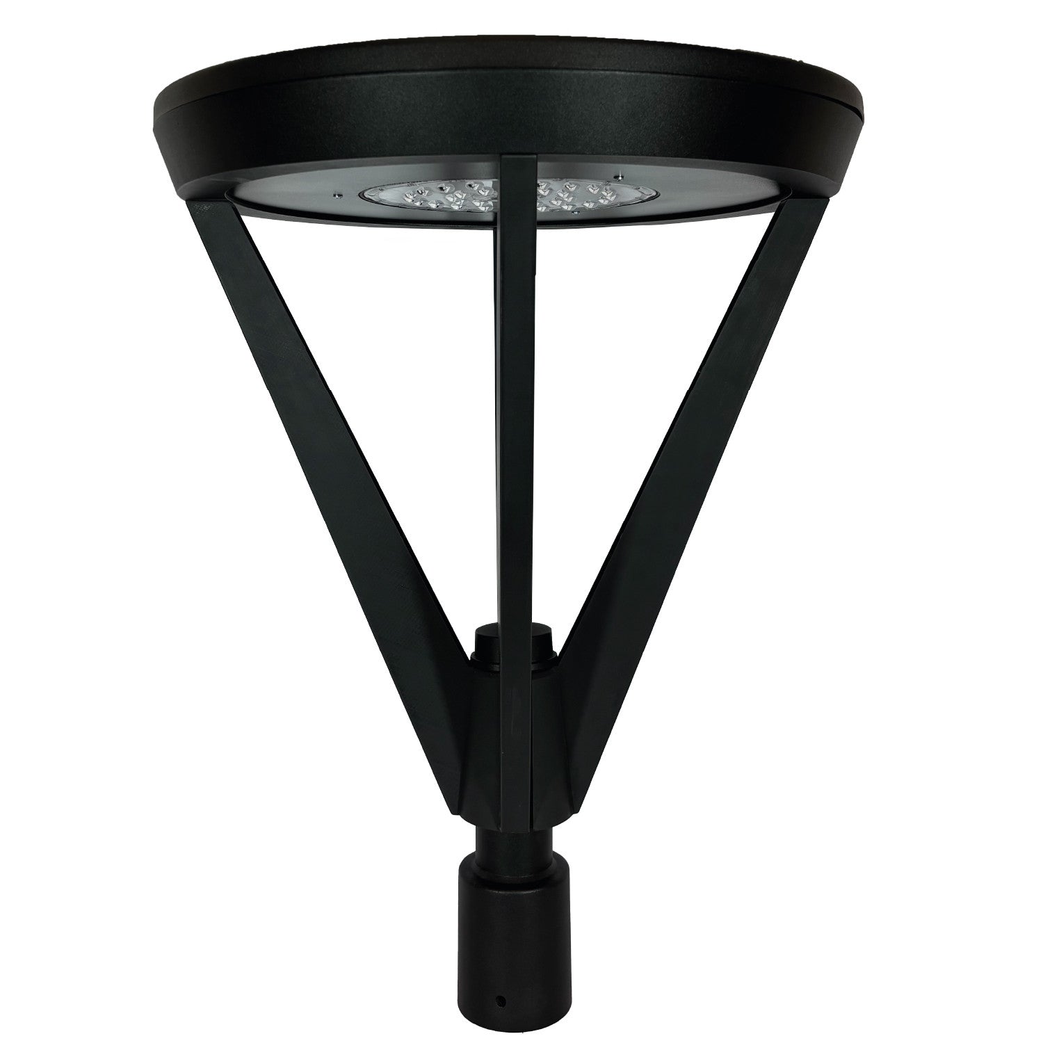Luminaria tipo punta de poste con un diseño moderno, fabricada en aluminio, integrado por módulo LED marca CREE con óptica integrada y driver electrónico programable marca Philips. Posibilidad de elegir óptica asimétrica o simétrica. Cumple con las normatividades exigibles.
