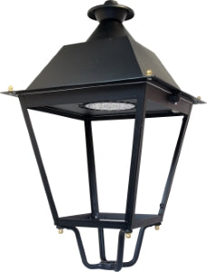 Luminaria tipo punta de poste con un diseño clásico, fabricada en aluminio, integrado por módulo LED marca CREE con óptica integrada y driver electrónico programable marca Philips. Posibilidad de elegir óptica asimétrica o simétrica.