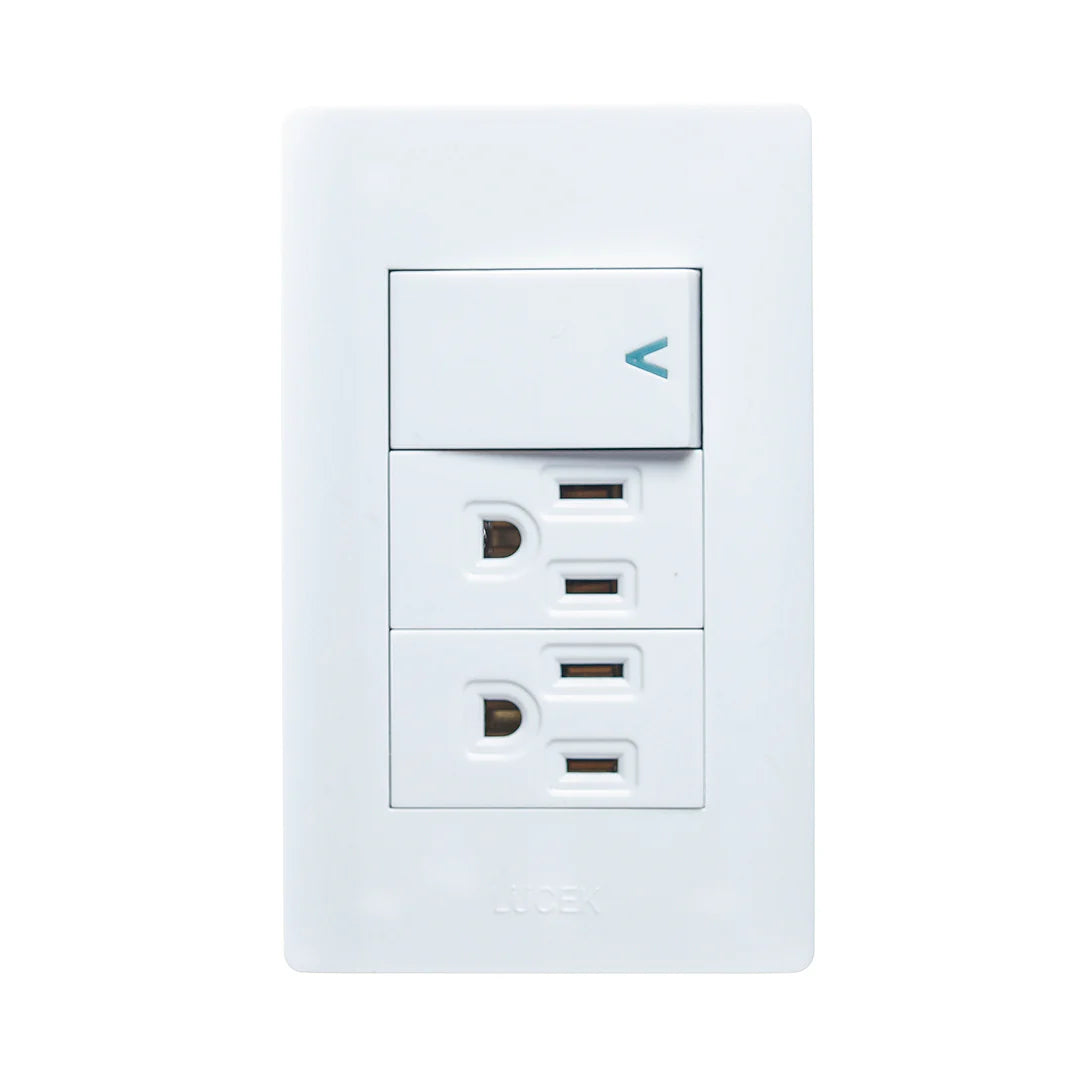 Placa de 3 módulos blanca con un apagador y dos contactos de 1 módulo. Muy económica y fácil de instalar. Tecla mas ancha. 10a (apagador) 15a (contacto) 127v.