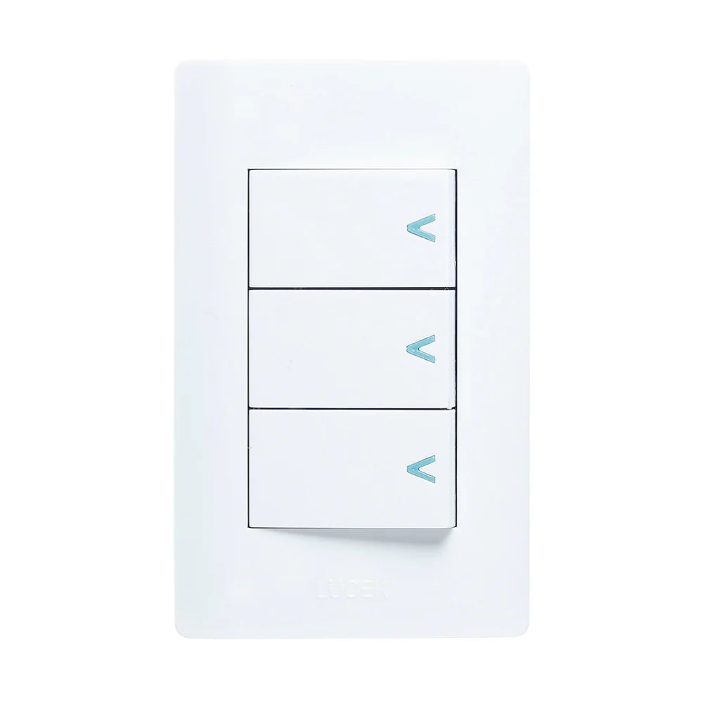Placa de 3 módulos blanca con tres apagadores sencillos de 1 módulo. Muy económica y fácil de instalar. Tecla mas ancha. 60hz 10a 127v.