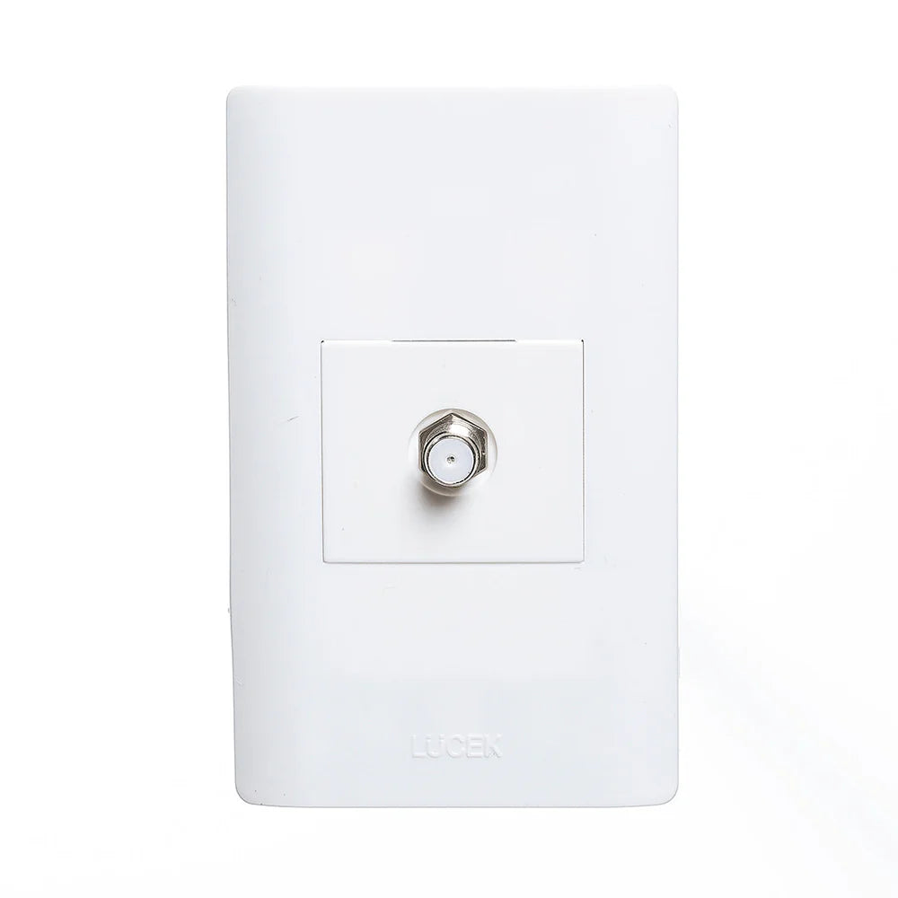 Placa de 1.5 módulos blanca con una toma coaxial de 1.5 módulos. Muy económica y fácil de instalar.