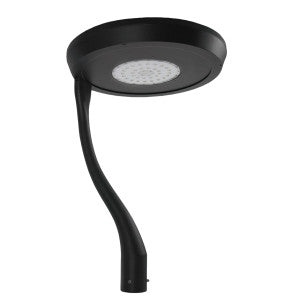 Luminaria tipo punta de poste con un diseño moderno, fabricada en aluminio, integrado por módulo LED marca CREE con óptica integrada y driver electrónico programable marca Philips. Posibilidad de elegir óptica asimétrica o simétrica.